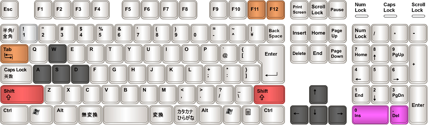 | Shift+Tab | 一番近い敵から順にターゲット(逆順) | F11 | 一番近くの敵をターゲット | F12 | 一番近くのNPC/オブジェクトをターゲット | テンキー【0】 | 決定 | テンキー【.】 | キャンセル |