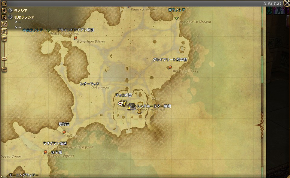 | リムサ・ロミンサ | ミスト・ヴィレッジ | 低地ラノシア シダーウッド:レッドルースター農場付近 | |
