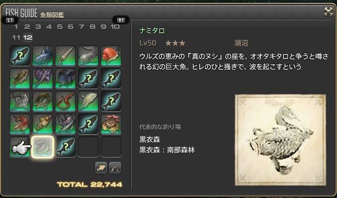 可能ならばガーロンドが欲しいところですが、他のヌシが天候指定がキツく、ガーロンド前にナミタロを釣る人は多分それなりにいるはずです